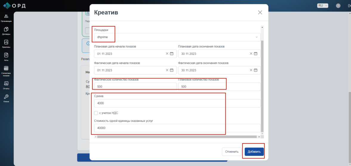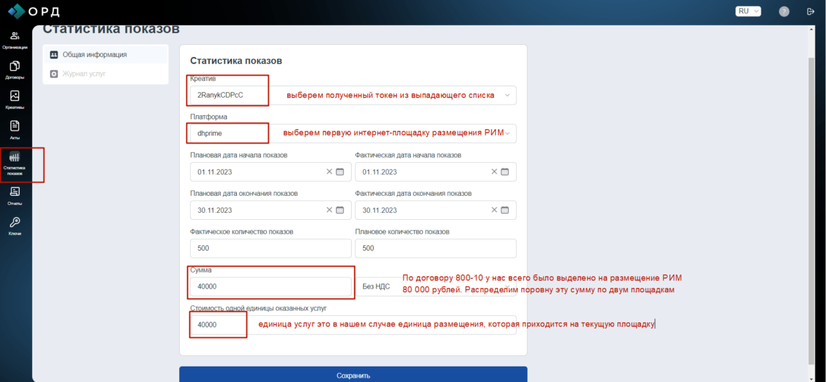 Был указан точный срок размещения, если бы у нас было размещение с 10.11.23 по 30.11.23, то указать надо именно его. Так как у нас общая сумма, которая была выделена на размещение 80 000 рублей, а площадки две, то мы смело указываем сумму для каждой площадке по 40 000 рублей либо можно распределить эту сумму пропорционально количествам показов на каждой площадке.