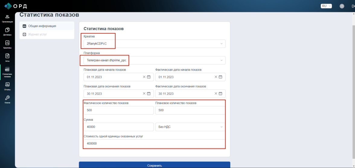 Количество показов, указанные выше можно взять из систем аналитики платформы размещения (например, из ленты Телеграм-канала либо системы аналитики платформы Телеграм) и с помощью Яндекс Метрики со своего сайта, указывая количество посещений страницы в ноябре 2023 года, где был размещен рекламный материал.