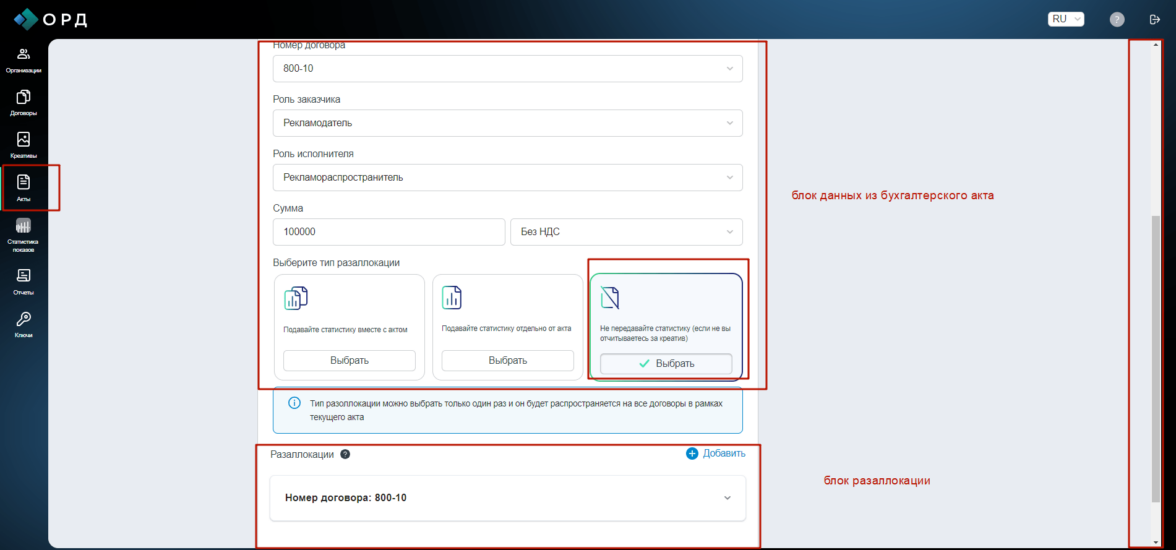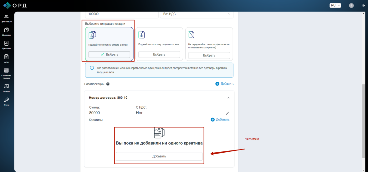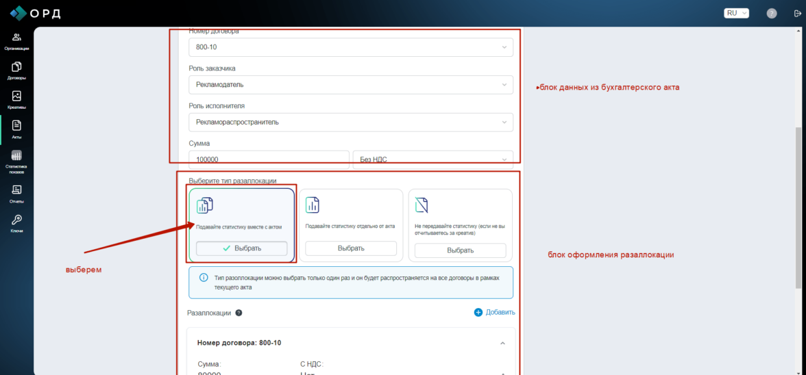 Вариант 3 для тех, кто по договору не загружал креативы и не получал токены в своем ОРД — он не будет подавать статистику как с помощью акта, так и отдельно с помощью блока Статистика. В данном случае будет иметь место только заполнение блока Акты с указанием разаллокации по изначальному договору, но без занесения данных по статистике показов креативов и без разаллокации по креативам.