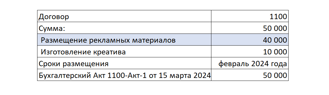 Предположим, что между Рекламодатель и Рекламораспространитель (мы) есть договор 1100 от 10 декабря 2023 года на размещение рекламных материалов в феврале 2024 года на сумму 40 000 рублей и дополнительным работам по договору (изготовление креатива) на 10 000 рублей. Рекламодатель оплатит услуги по размещению и Рекламораспространитель (блогер) выставит для Рекламодателя бухгалтерский (бумажный акт) 1100-Акт-1 в марте 2024 года на общую сумму работ по договору в размере 50 000 рублей.