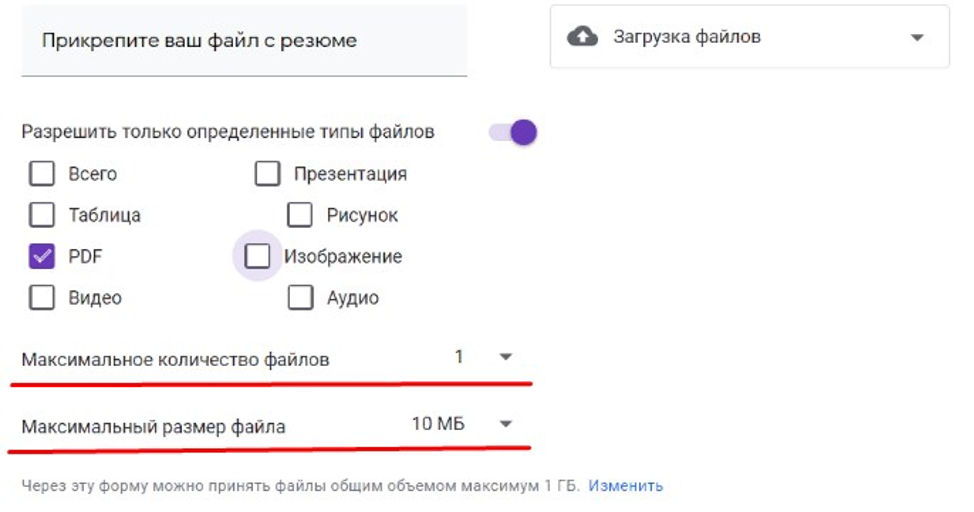 Здесь в качестве ответов, опрашиваемые могут загружать свои файлы. Это удобно, когда вы хотите получить от аудитории резюме, фото, кейсы, примеры работ. Заранее укажите тип документа и максимально допустимый размер.