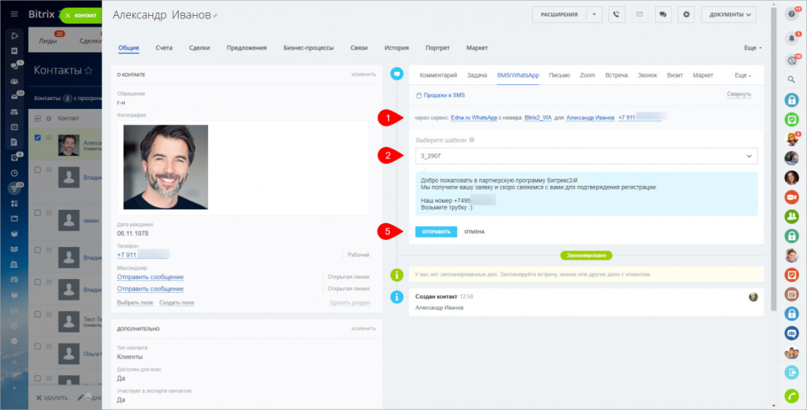 Отправка приветственного сообщению клиенту в WhatsaApp встроена в стандартный функционал.