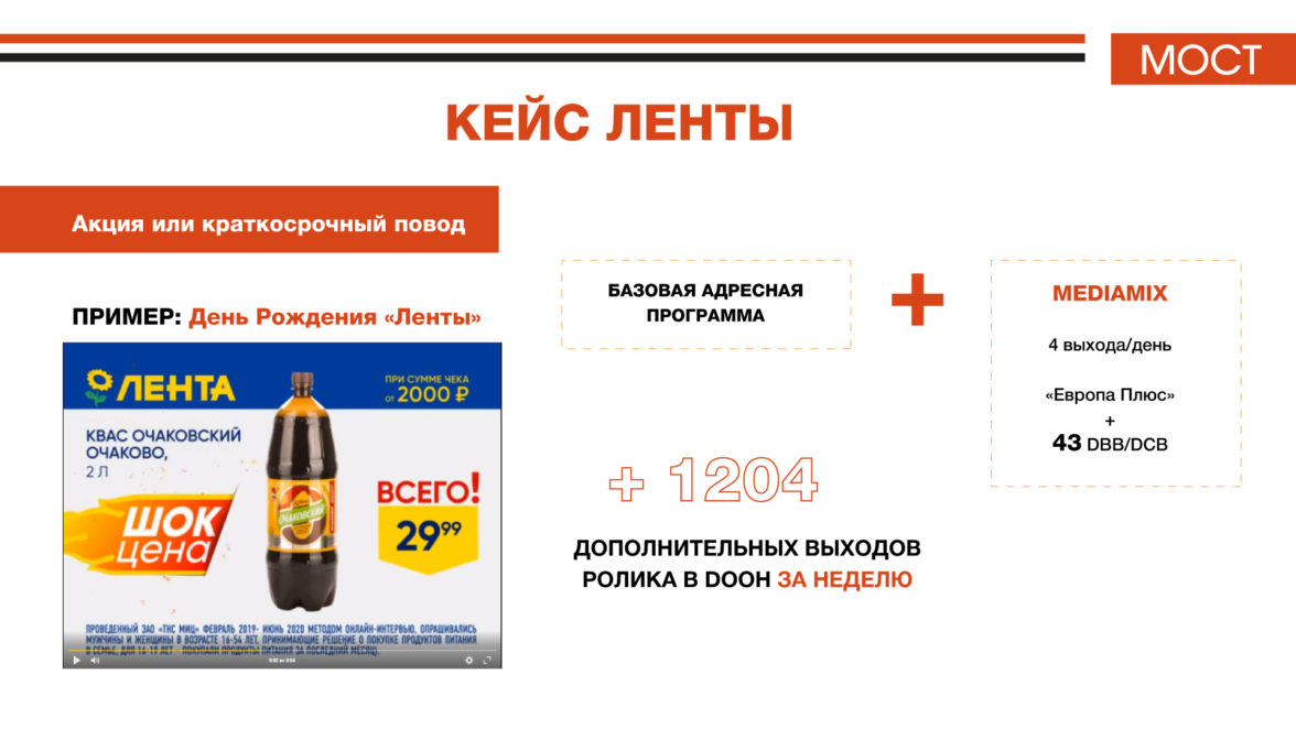 «Многочисленные рекламные эксперименты, проводимые исследовательским компаниями в разных странах* в разное время и для различных продуктовых групп, показывают, что использование для рекламы нескольких каналов восприятия всегда дает больший эффект, чем использования любого канала “соло”. В данном случае реклама не только имеет визуальную и аудио-составляющую, но еще и синхронизирована по воздействию. Несомненно, это выделит рекламодателя из общей массы, и даст ему приоритетное внимание потенциального покупателя».