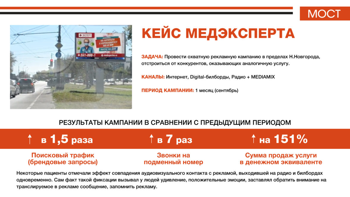 «Основная задача Медицинского центра “Эксперт” — увеличение охвата аудитории, а именно Нижегородцев возрастом от 18 лет. Для этого мы используем обширный перечень рекламных инструментов: рекламу в интернете, наружную рекламу и рекламу на радио и ТВ. Таким образом, совмещая оффлайн и онлайн рекламу, отдел маркетинга медицинского центра “Эксперт” добивается увеличения охвата аудитории — наших потенциальных клиентов. В 2020 году, когда россиян накрыла волна заболевания COVID-19, Медицинский центр “Эксперт” начал проводить анализы на коронавирус. В условиях, когда эту услугу оказывало много медицинских центров и лабораторий по схожим ценам и срокам, перед отделом маркетинга стояла задача — отстройка от конкурентов. Кроме настройки интернет-рекламы, было решено запустить ролики на DIGITAL-билбордах. Так же параллельно был запущен ролик (хронометраж 20 сек) на популярной в Нижнем Новгороде радиостанции “Европа Плюс”. Агентство “МОСТ” презентовало нам проект «МЕДИАМИКС», позволяющий создать дополнительный эффект восприятия нашего рекламного сообщения. Нас заинтересовала возможность синхронизации рекламных выходов на радиостанции Европа Плюс и 40 DIGITAL-билбордах «Volga Outdoor». Эффективность рекламы мы отслеживаем с помощью Яндекс.Метрики, Колл-трекинга и показателей из базы клиентов 1С. Сравнивались такие показатели, как: — Кол-во брендовых запросов (через Wordstat), SEO-трафик. По сравнению с предыдущим периодом поисковый трафик на сайт вырос в 1,5 раза и на протяжении осени постоянно рос. — Кол-во звонков на подменный номер (в рекламе использовали подменный номер). Кол-во звонков на этот номер выросло в 7 раз. — Кол-во пациентов, делающих анализы на COVID-19 (посредством базы 1C в денежном эквиваленте). Так по сравнению с предыдущим периодом, сумма продаж анализов выросла на 151%.