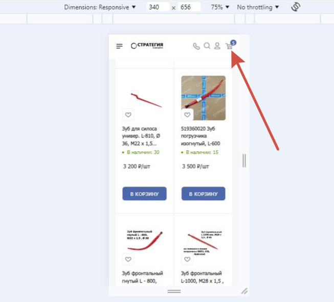 На мобильных устройствах показывается только число товаров у иконки, размещенной в фиксированной шапке.