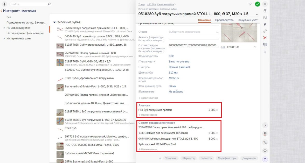 Далее мы создали для всех товаров в СБИС новые свойства «Аналоги (штрихкоды…)» и «С этим товаром покупают (штрихкоды…)». В их поля вручную вписали штрихкоды товаров — аналогичных и покупаемых совместно — относящихся к конкретной карточке. Эти свойства импортируются на сайт как обычные характеристики.