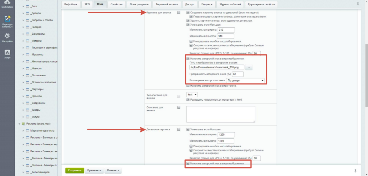 В «1С-Битрикс» есть стандартная настройка инфоблока, позволяющая преобразовывать размер изображения и накладывать водяной знак при добавлении анонсной и детальной картинок.