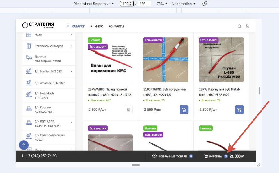 На десктопных устройствах шириной меньше 1200 пикселей отображается только корзина в фиксированной нижней панели. В ней отражается количество товаров и сумма заказа.