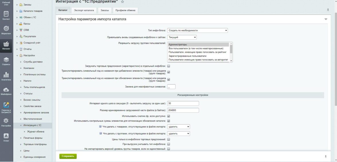 Этот же штрихкод товара мы решили использовать как уникальный идентификатор, единый для сайта и СБИС. Поэтому в настройках импорта задали замену внешнего кода товара, получаемого из стандартной выгрузки, на штрихкод. А также прописали использование значения штрихкода в качестве символьного кода элемента каталога. Это, помимо прочего, обеспечивает единообразие url товарных карточек.