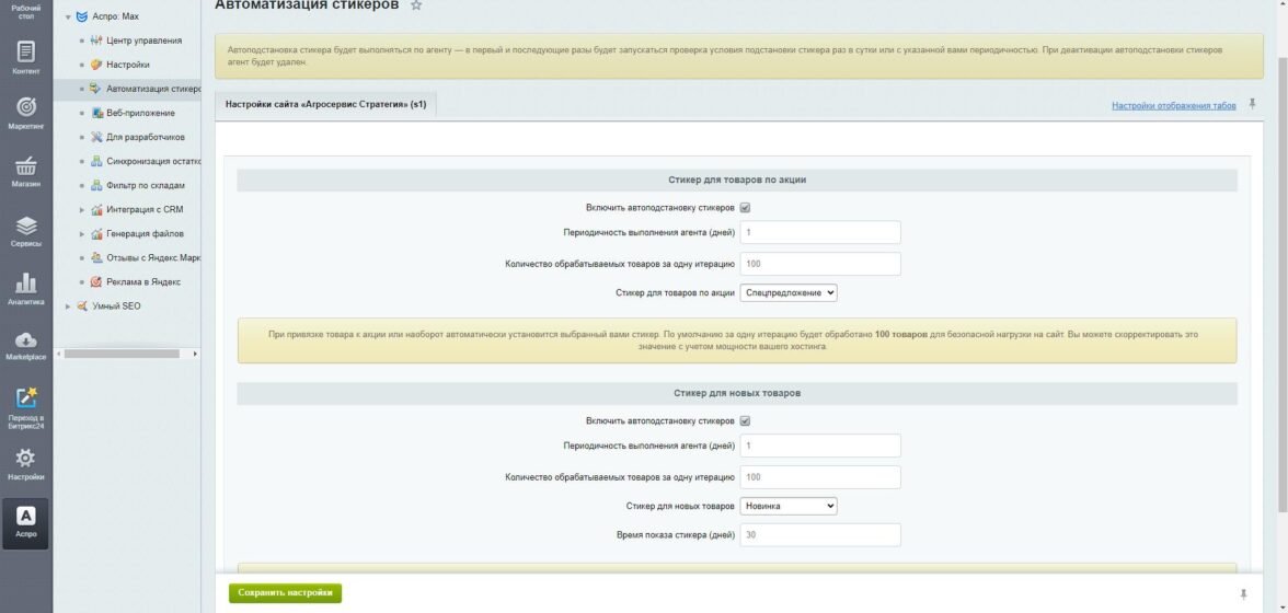 Автоматизация стикеров — специальных меток для товарных карточек — частично уже решена командой «Аспро» — разработчиком решения «Аспро: Максимум», на котором мы реализовали наш проект. Ребята, как и мы, постоянно ищут возможности автоматизировать рутинные процессы, и имеют в своем арсенале простое, но очень удобное решение для автоматизации стикеров «Новинка» и «Специальное предложение».
