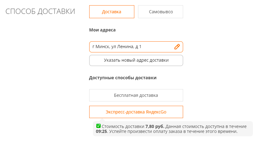 После подтверждения возможности доставки на этапе оформления заказа в системе Яндекс Доставка происходит предварительное бронирование, и клиенту предоставляется время для оплаты заказа онлайн.