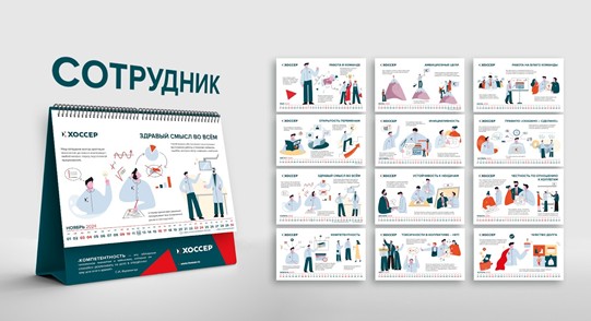 Такую концепцию мы использовали при разработке настольного календаря для ГК «Хоссер». В компании действует развернутый корпоративный кодекс с подробными портретами сотрудника и руководителя. Команда 4D переработала 50-страничный текст в информативные и понятные тезисы по каждому из смысловых блоков. Главную смысловую нагрузку перенесли на инфографику. Получился настоящий комикс с красочными сценками из рабочих будней линейных сотрудников и руководства. Вышло ярко и нескучно, а главное помогло достичь основной цели — внедрить напоминание о корпоративных ценностях в повседневную рутину.