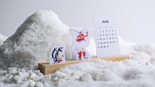 Конструкция на деревянной основе состоит из трех планов (задний, средний и передний), где пользователь сам расставляет карточки в определенном порядке. Каждый месяц — новая композиция из жизни Арктики и Антарктики. Получился не просто календарь, а полноценный интерактивный артефакт, с которым приятно взаимодействовать.