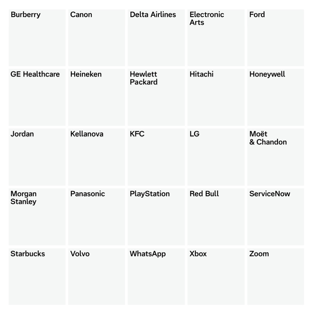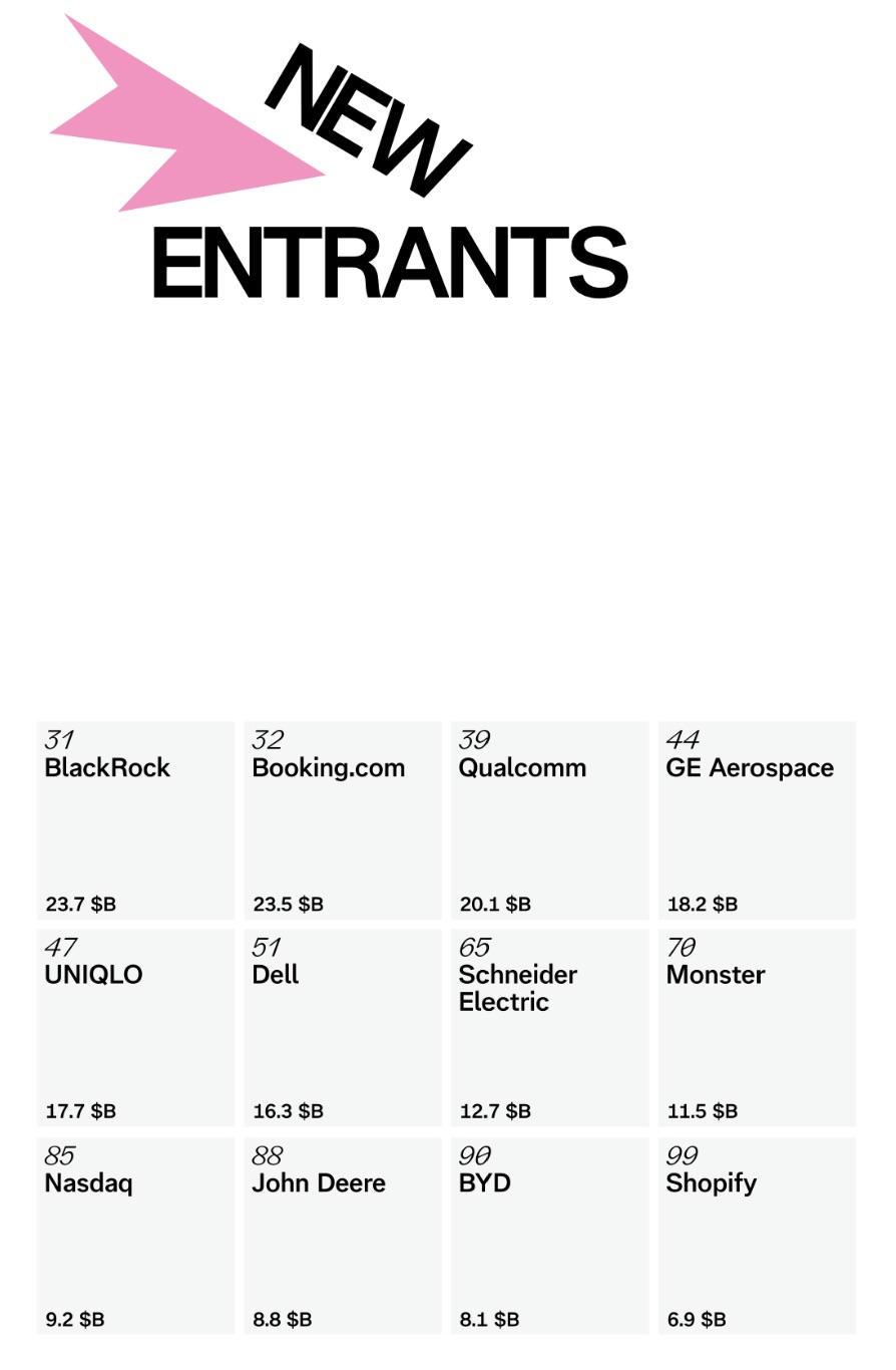 В рейтинге Interbrand 2025 года немало новых названий. Самый успешный из новичков — бренд хедж-фонда Black Rock, с ходу запрыгнувший на 31-е место (оценка $23,7 млрд). Сразу за ним, на32-й строчке, сервис онлайн-бронирования туристических услуг Booking.com ($23,5 млрд). Qualcomm (разработка и производство микросхем — на 39-м месте ($20,1 млрд), GE Aerospace (производство авиационных двигателей) — на 44-м ($18,2 млрд). Бренд японских магазинов одежды Uniqlo — 47-й ($17,7 млрд). Во второй половине рейтинга — Dell, Schneider Electric, Monster, Nasdaq, John Deere, BYD, Shopify.