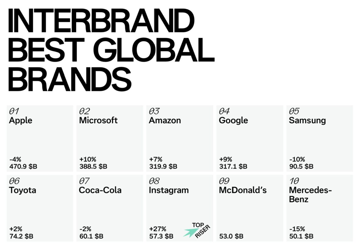 «Самое масштабное в мире лонгитюдное исследование роли брендов в увеличении доходов и создании рыночной стоимости» — так консалтинговая компания Interbrand характеризует рейтинг Best Global Brands. Рейтинг публикуется ежегодно, начиная с 2000 года. При оценке бренда учитываются три ключевых компонента: финансовые показатели брендированных продуктов или услуг, роль бренда в принятии потребителем решения о покупке и конкурентоспособность бренда.