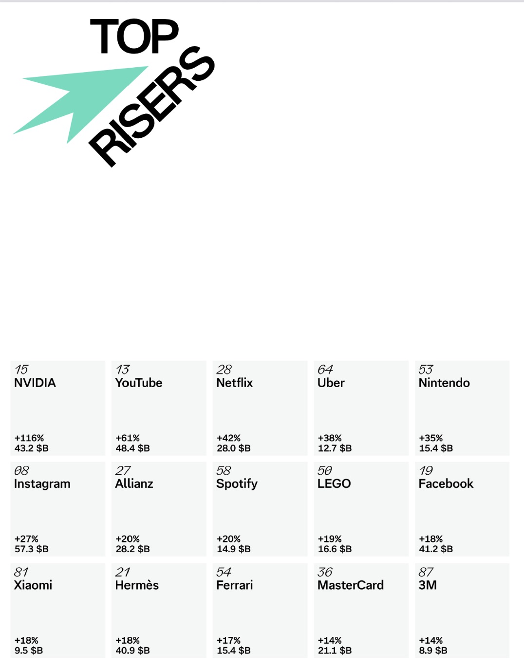 Бренд Instagram не только попал в первую десятку по стоимости, но и вошел в отдельный рейтинг — брендов, чья оценка выросла сильнее всего в относительном выражении. Если для Instagram этот рост составил 27%, то для самого подорожавшего за год бренда Nvidia — впечатляющие 116%. Что неудивительно, так как именно на чипах Nvidia будут работать ИИ-агенты, которые в будущем будут прислуживать сильным брендам и пинать ногами слабаков. Смело можно предположить, что бренд Nvidia, занимающий в общем рейтинге этого года 15-е место, в рейтингах будущих лет станет занимать более высокие позиции.