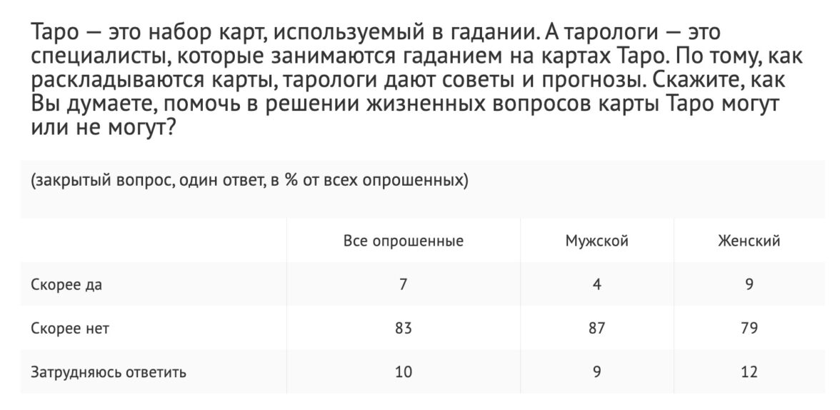 6% россиян (8% женщин и 3% мужчин) раскладывали карты самостоятельно. 5% обращались к астрологу (6% женщин и 3% мужчин). 5% смотрели расклады в интернете (9% женщин и 2% мужчин). В сумме получается 15% (из-за округления цифр при обработке данных опроса до ровных процентов). Интерес россиян к картам Таро выше, чем интерес американцев, в США аналогичный показатель составляет 11%.