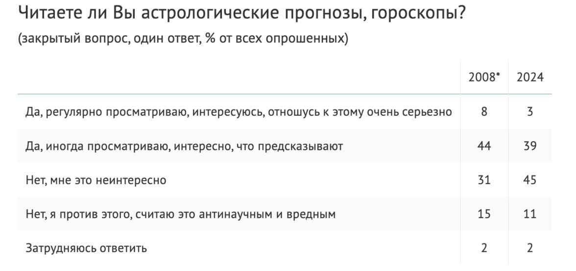 Всероссийский телефонный опрос «ВЦИОМ-Спутник», в котором задавались вопросы о вере в гороскопы, прошел 3 марта 2024 года. Метод опроса — телефонное интервью по стратифицированной случайной выборке, извлеченной из полного списка сотовых телефонных номеров, задействованных на территории РФ. В опросе приняли участие 1600 россиян в возрасте от 18 лет. Данные были взвешены по социально-демографическим параметрам. Аналогичный опрос, касавшийся карт Таро, прошел 22 ноября 2024 года.