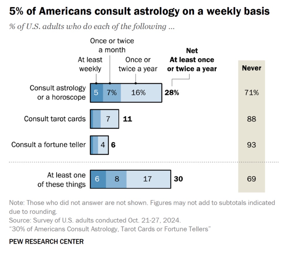 В астрологию верят 27% взрослых американцев. Самая высокая доля любителей астрологии — среди женщин 18–49 лет — 43%. Самая низкая — среди мужчин старше 50 лет — 16%.