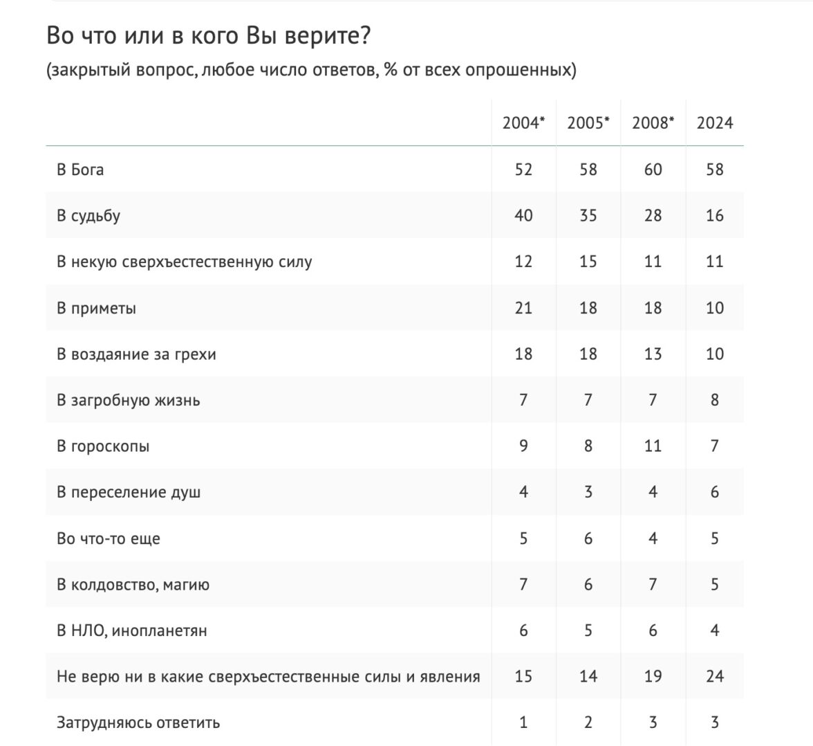 Как показывает опрос ВЦИОМ на тему «Таинственное и потустороннее, или россияне о магах и астрологах», 7% россиян верят в гороскопы (самый низкий за последние десять лет показатель), 5% — в колдовство, магию, 10% — в приметы. Ни во что сверхъестественное не верит каждый четвертый россиянин (24%) — это самый высокий за десятилетия показатель.
