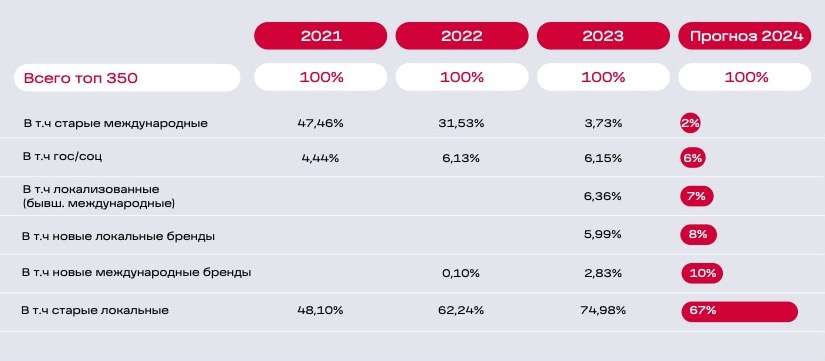 В SA Media Group прогнозируют в 2024 году резкий рост доли новых международных и локальных брендов — до 10% и 8% соответственно. Старые международные бренды продолжат терять свои позиции — доля упадет до 2%. При этом вновь прибывшие игроки потеснят старые локальные бренды, доля которых снизится до 67%. «Уж сейчас 9% рынка — абсолютно новые бренды», — отметил Дмитрий Казаков.