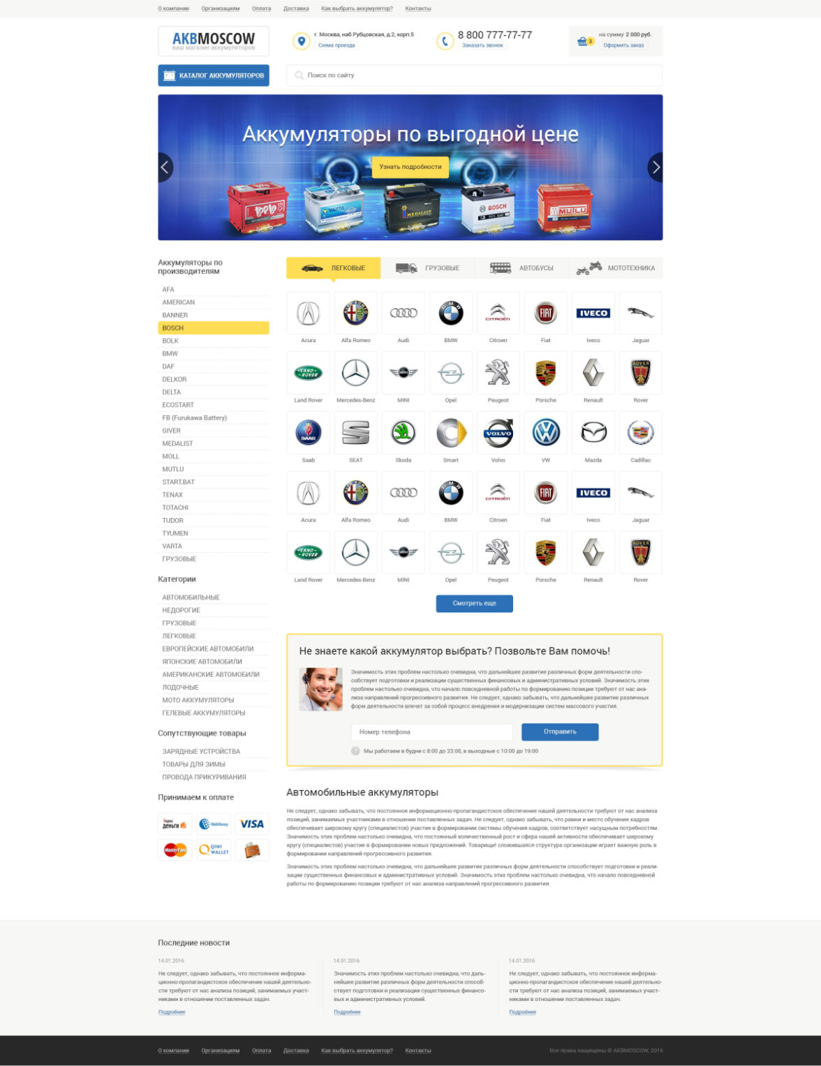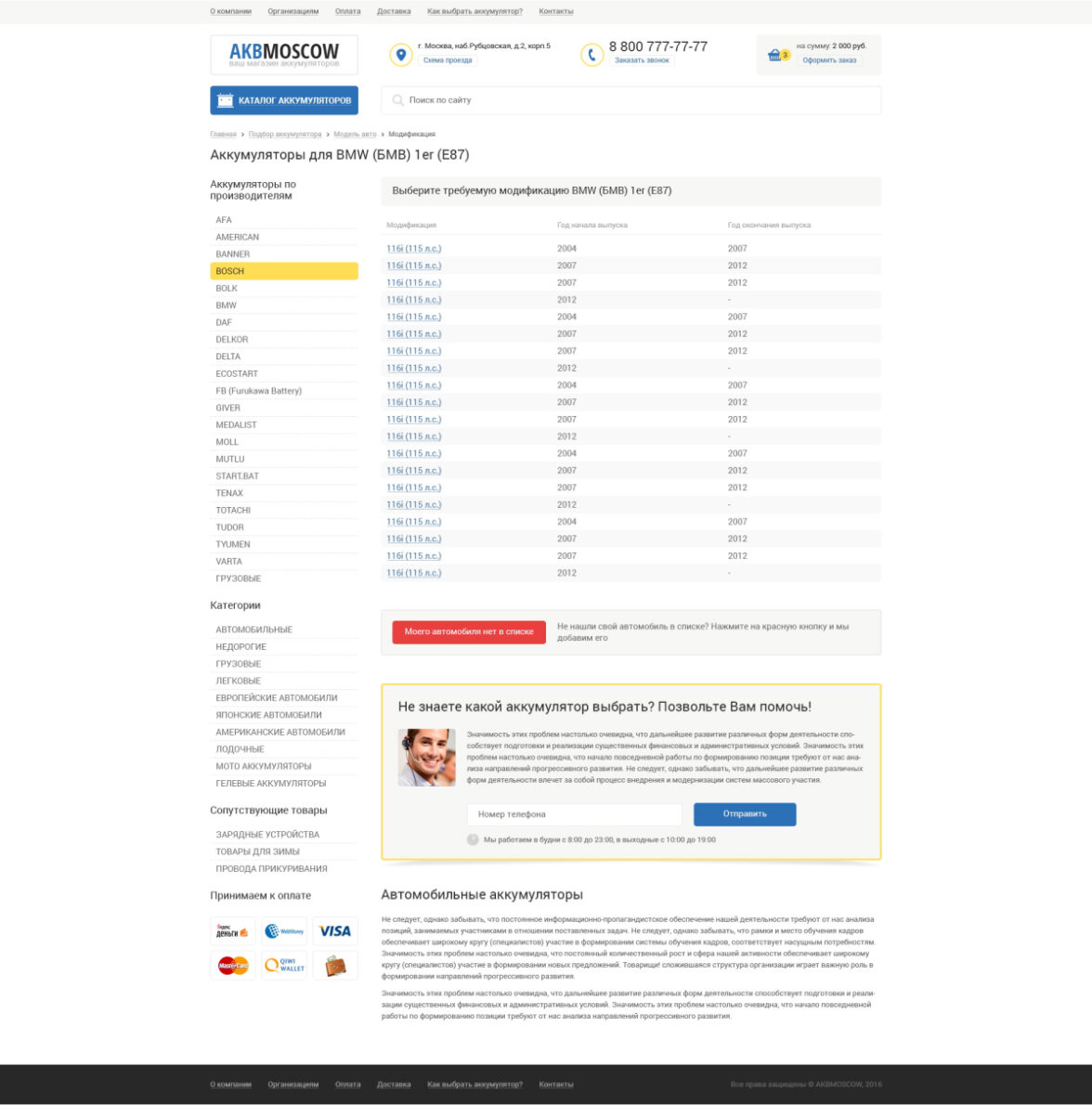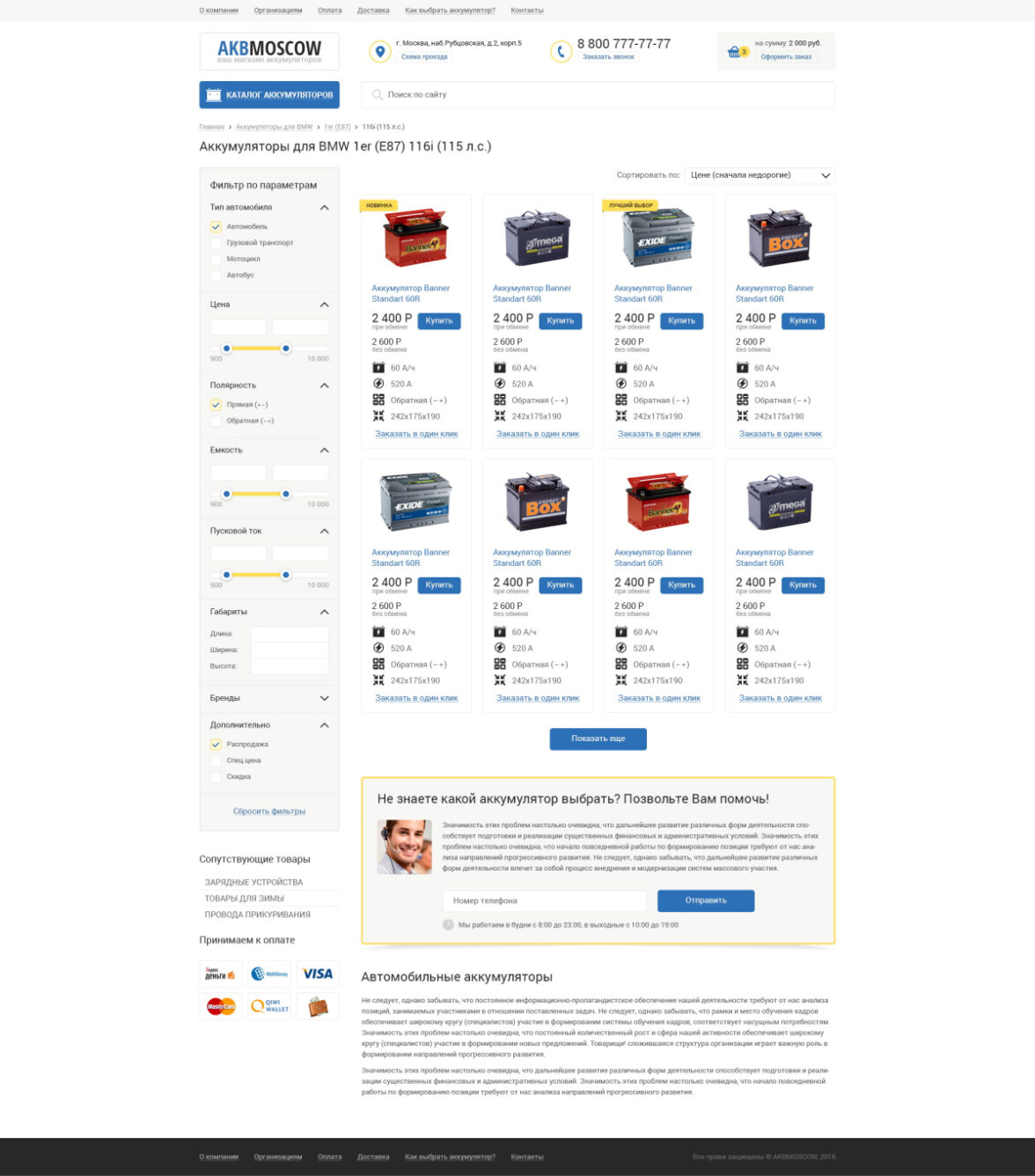 Разработать интернет-магазин АКБ с фильтром подбора аккумулятора.