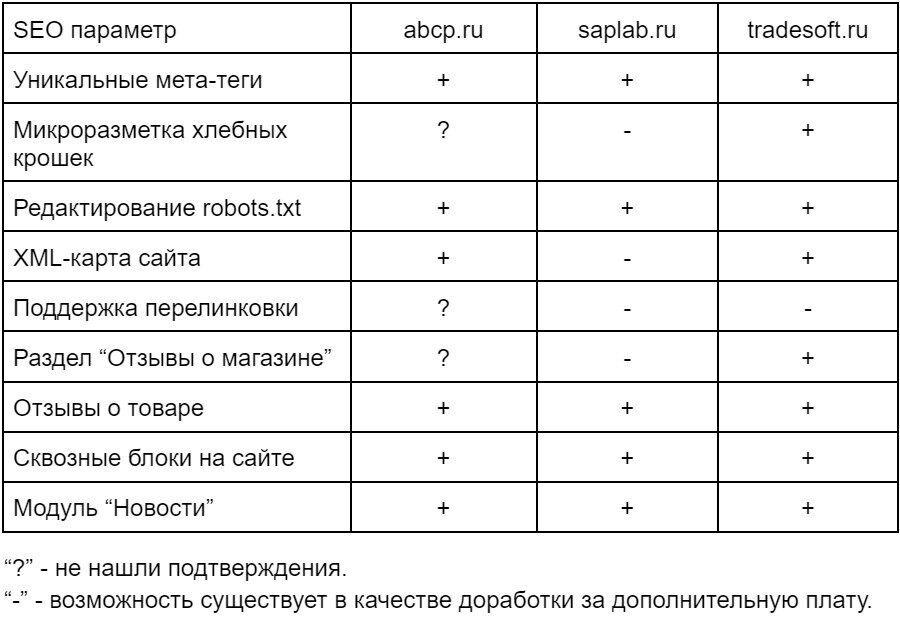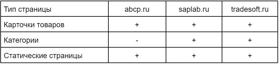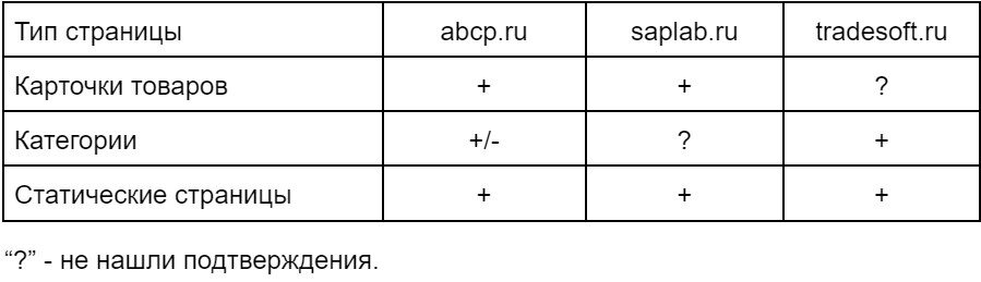 Рассмотрим возможности продвижения в Яндекс и Google в наиболее популярных в России платформами abcp.ru, saplab.ru и tradesoft.ru.Перед анализом отметим, что на платформах большое количество типов страниц (бренды, новости, категории, подкатегории, товарные группы, карточки товаров, различные типы каталогов), настройки для каждой группы могут быть индивидуальны.
