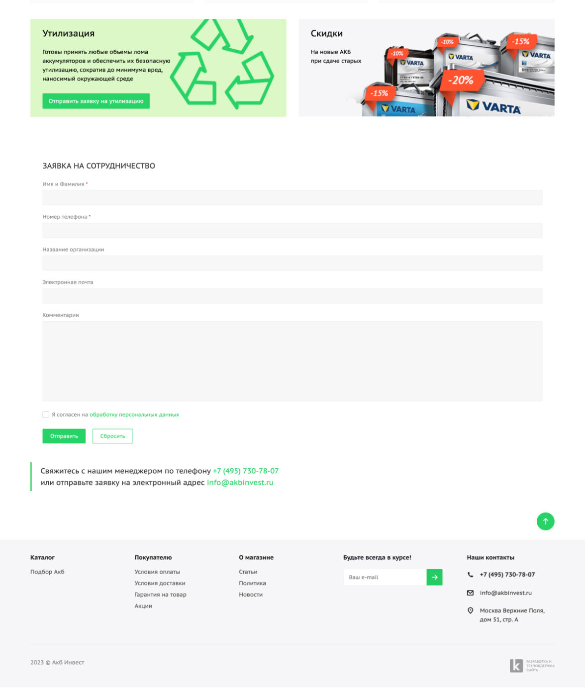 Интернет-магазин аккумуляторов АкбИнвест более 8 лет помогает клиентам подобрать АКБ, купить, установить или утилизировать аккумуляторные батареи. Работает со всеми известными производителями