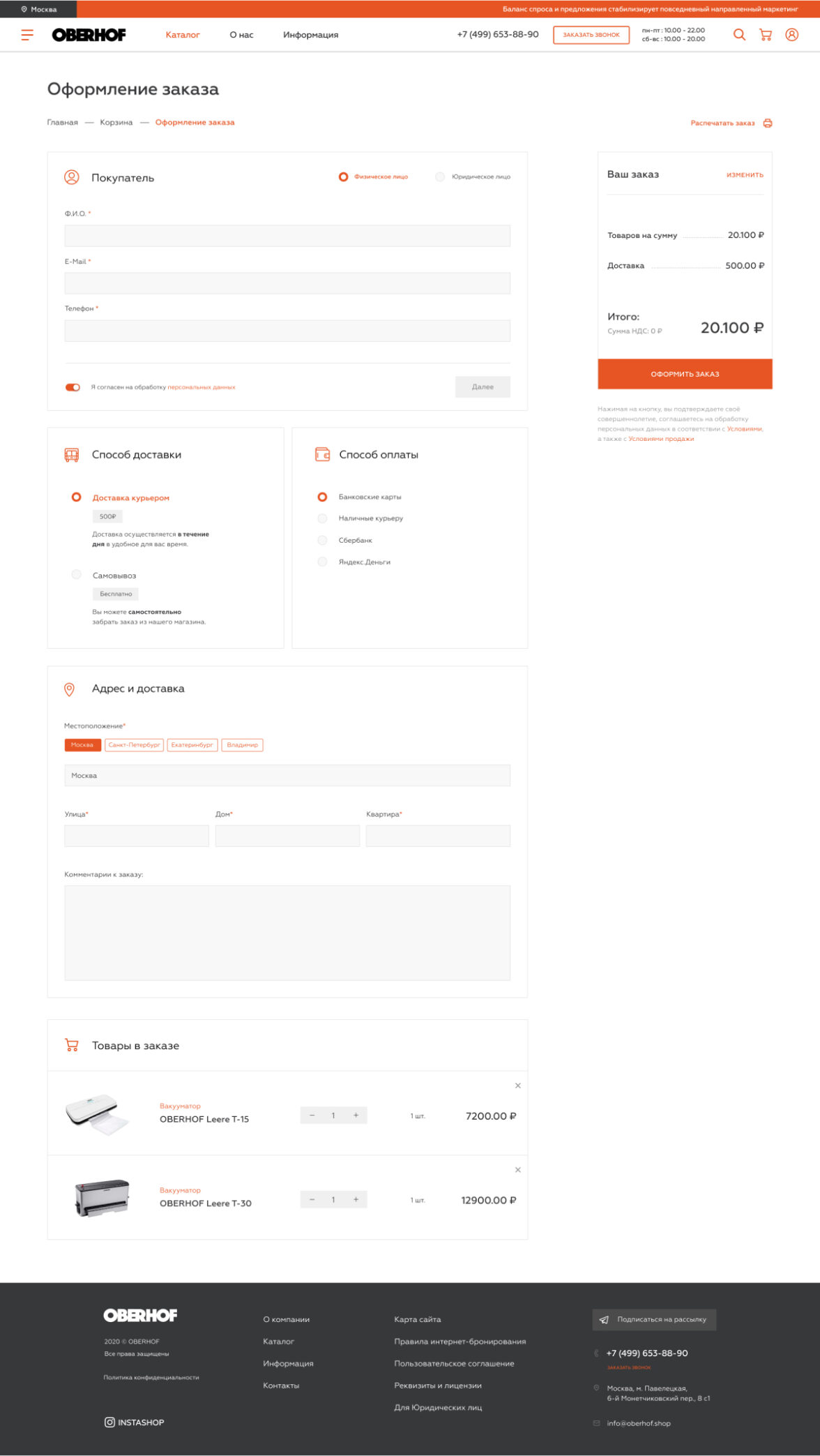 В корзине реализована возможность покупки для физических и юридических лиц.