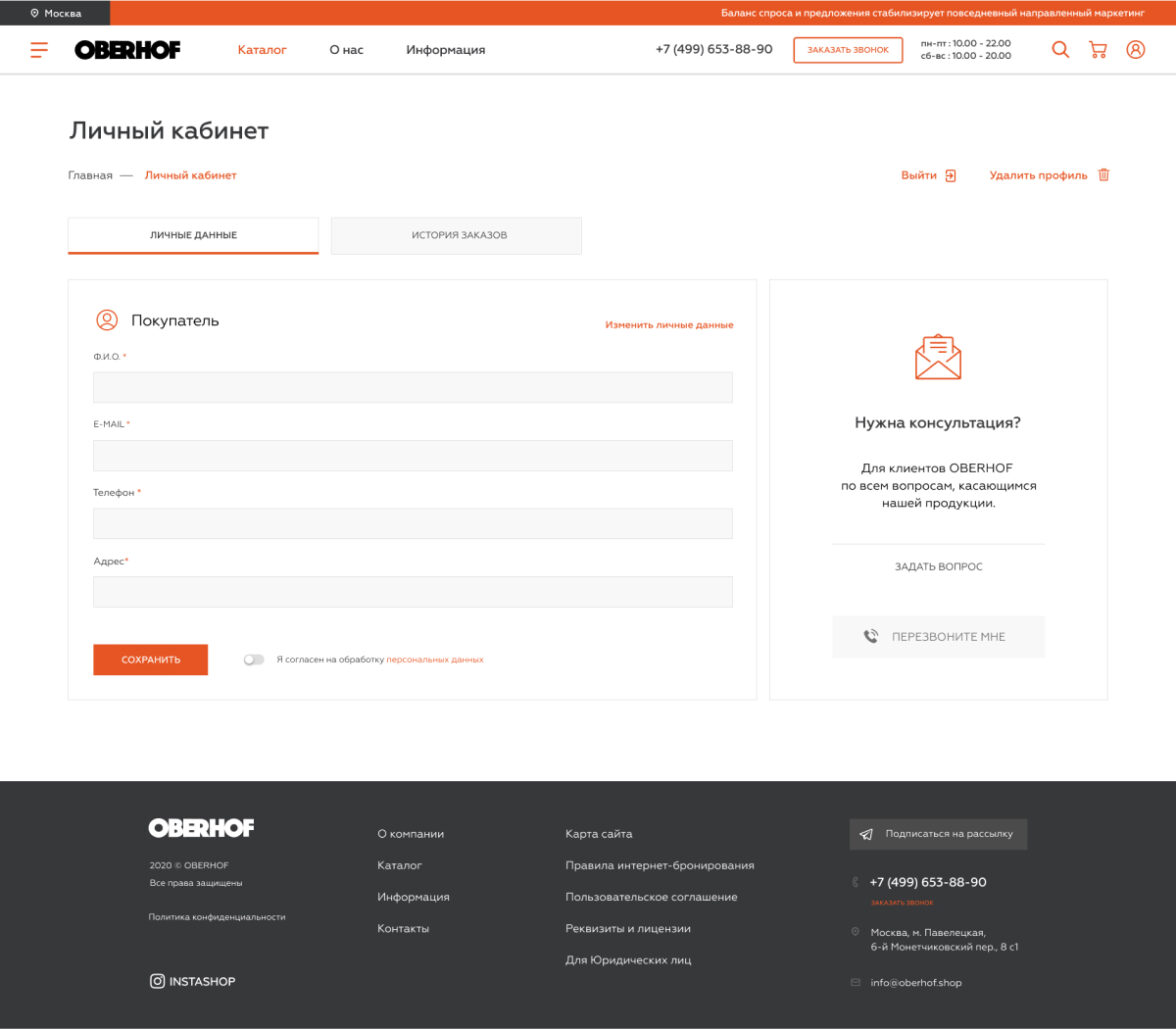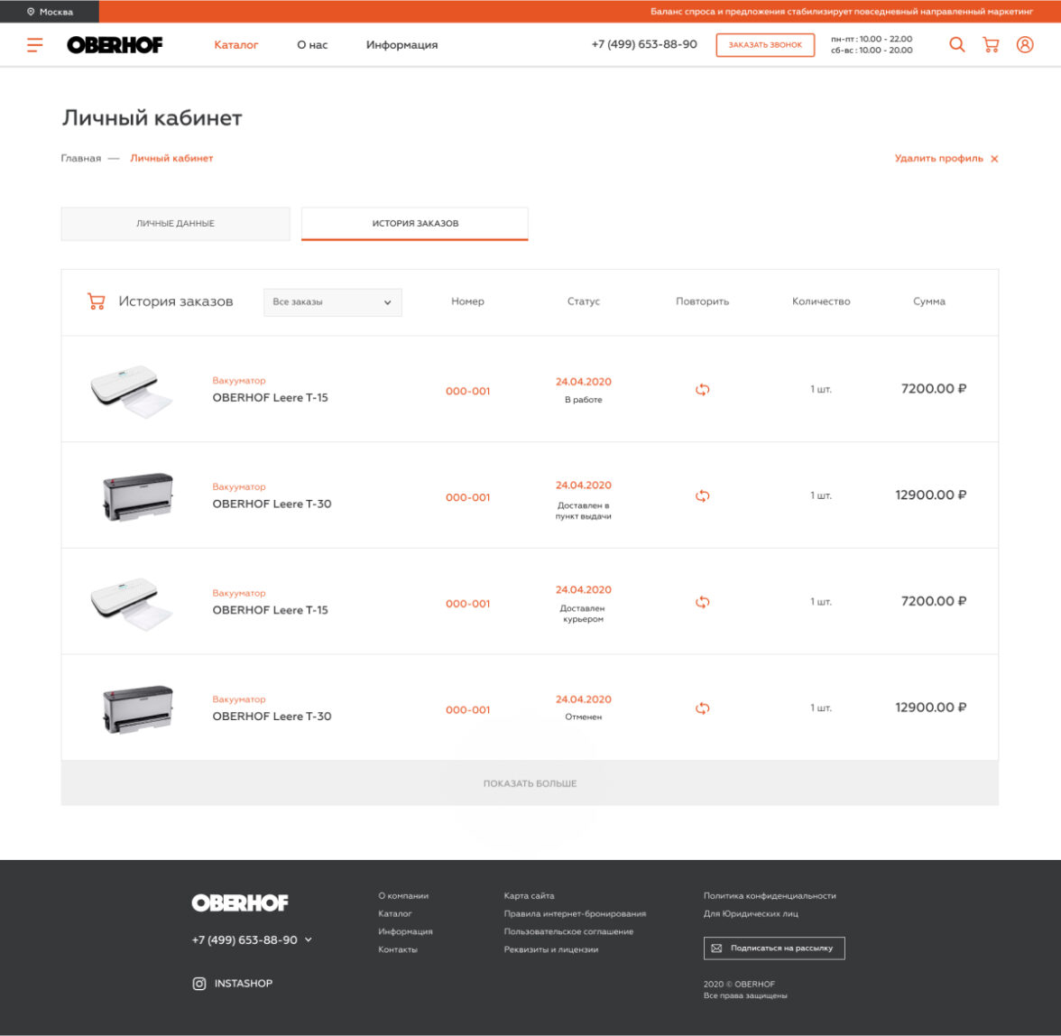 В личном кабинете интернет-магазина пользователи имеют возможность посмотреть историю заказов, а также задать вопрос в техническую поддержку компании