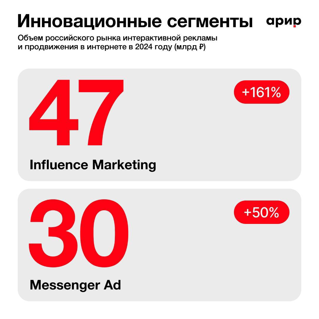 В инновационном интернет-сегменте наибольший рост показала реклама у инфлюенсеров. Расходы на этот вид продвижения выросла на 161% и достигли 47 млрд рублей в 2024 году.