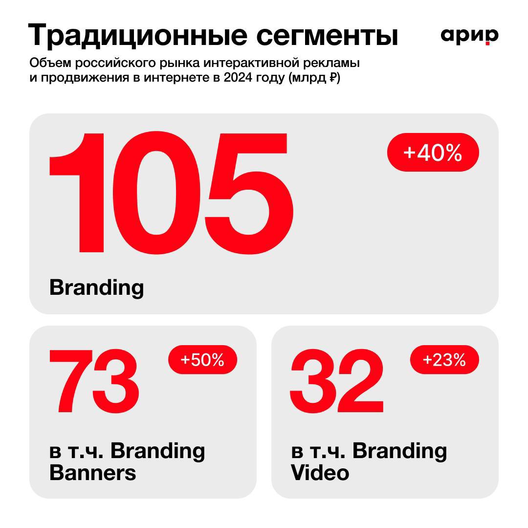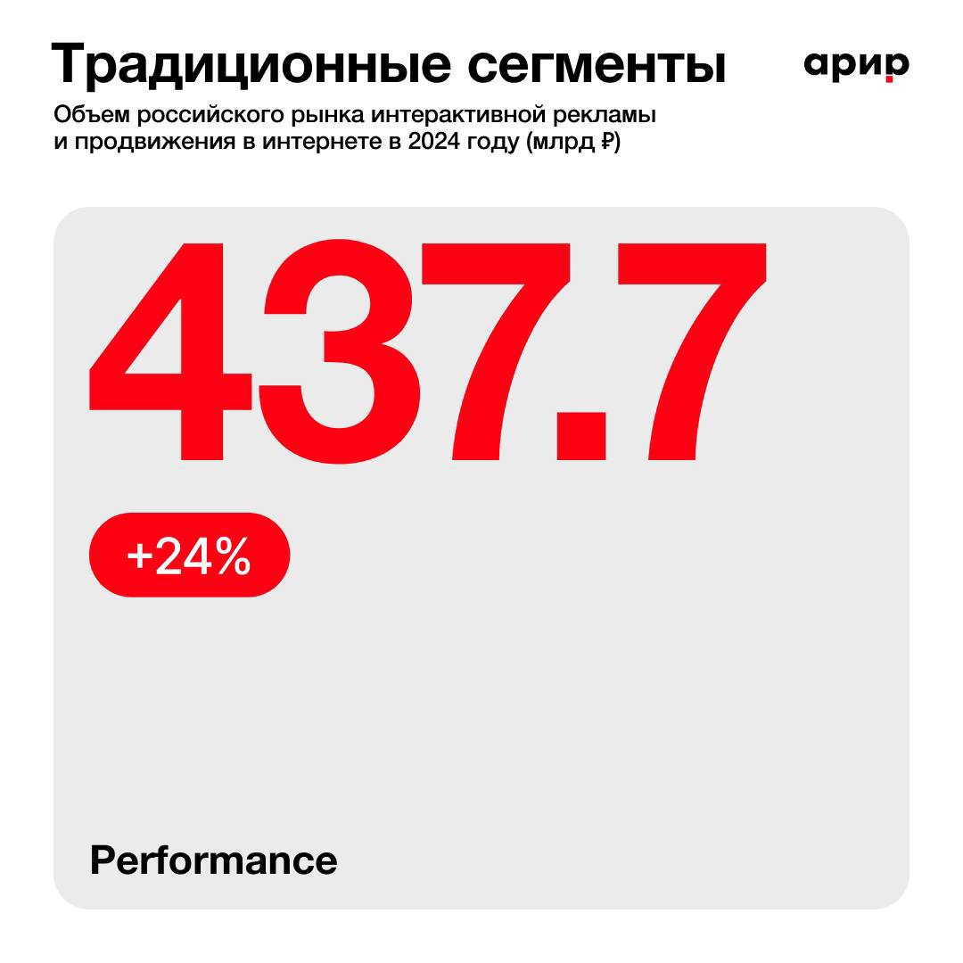 Сегмент performance-рекламы рос почти в два раза медленнее, увеличившись всего на 24%. При этом на него приходится большая часть бюджетов в традиционном сегменте: эксперты АРИР оценили расходы на этот формат в 437,7 млрд рублей.