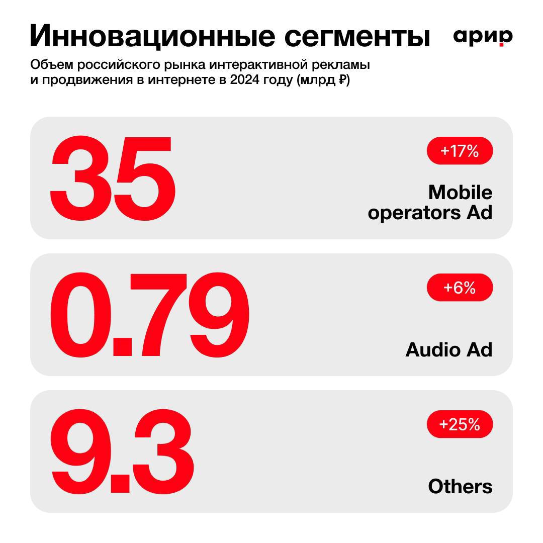 Другие инновационные подсегменты в прошлом году росли минимум втрое медленнее форматов-лидеров. Вложения в рекламу в мессенджерах составили 30 млрд рублей (+50% к 2023 году), классифайды показали рост на 36% до 190 млрд рублей. Объем рекламы у мобильных операторов увеличился на 17% до 35 млрд рублей. Меньше всего прибавила аудиореклама: 6% при расходах в 790 млн в прошлом году.