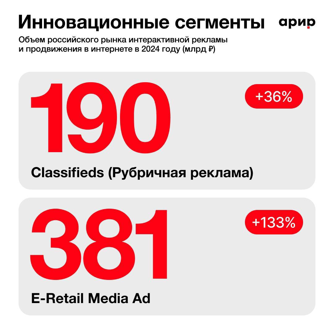 АРИР делит рынок интерактивной рекламы и интернет-продвижения на два сегмента: традиционный и инновационный.К традиционному относятся бюджеты на имиджевую (branding) и performance-рекламу (поисковая, контекстная, таргетированная, в мобильных приложениях и в соцсетях). Во втором сегменте учитываются расходы на интернет-классифайды, инфлюенсеров (influencer marketing), цифровую аудиорекламу, рекламу в мессенджерах и у мобильных операторов, а также в ритейл-медиа.