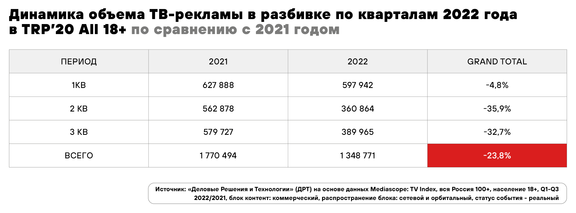 В пунктах рейтинга сокращение объема рекламного инвентаря на телеканалах было меньше. Во II квартале количество рейтингов уменьшилось на 35,9%, в III — на 32,7%. «Объемы рекламы на федеральном ТВ по итогам девяти месяцев по сравнению с аналогичным периодом прошлого года снизились на 23,8%, учитывая показатели I квартала (-4,8%)», — рассказала ADPASS Виолета Родионова, директор по управлению рисками в области рекламы и медиа ДРТ.