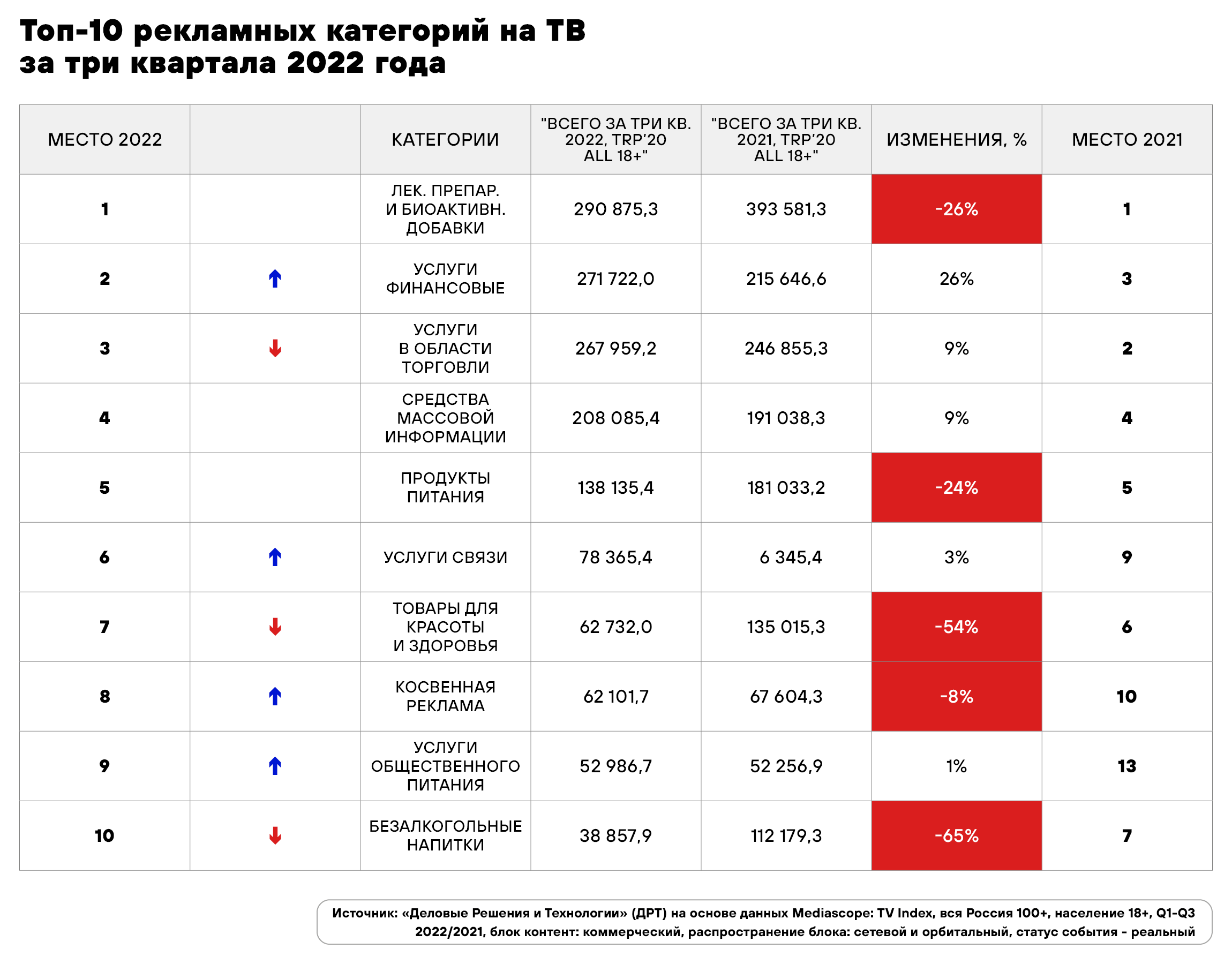 Отрицательную динамику демонстрирует половина рекламных категорий из первой десятки, констатировала Родионова. Больше всего просели безалкогольные напитки — объем телерекламы производителей упал на 65%, а категория опустилась на десятую строку, хотя по итогам девяти месяцев прошлого года занимала седьмое место. На 54% снизилось количество телерекламы товаров для красоты и здоровья, из-за чего категория опустилась в этом году на седьмое место, хотя год назад была на шестом. При этом лекарственные препараты и биоактивные добавки хотя и потеряли 26%, но удержали первую строку.