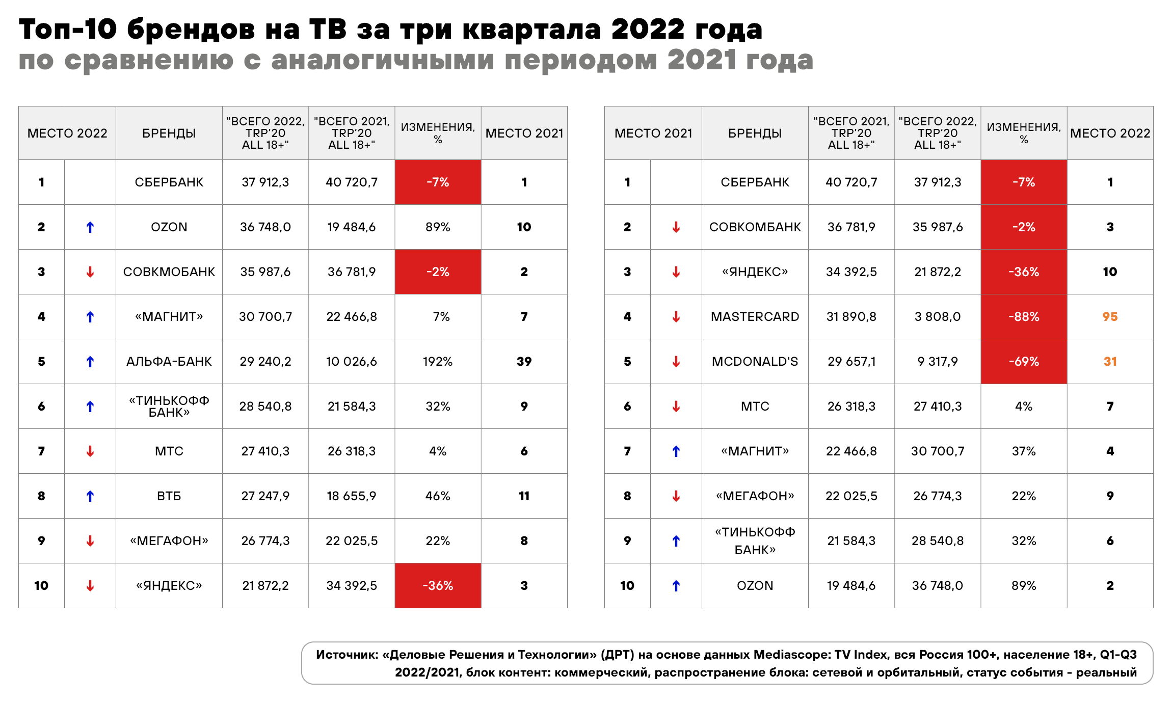 Первая десятка брендов изменилась не столь существенно — как в сравнении с результатами первого полугодия, так и относительно девяти месяцев 2021 года. Первое место у «Сбербанка», сократившего телевизионный объем на 7%. Всего по итогам девяти месяцев в топ-10 вошли четыре банка: наряду со «Сбером» это «Совкомбанк» (третья строка против второй годом ранее), «Альфа-банк», поднявшийся с 39-го на пятое место с ростом объема рейтингов на 192%, и ВТБ, увеличивший присутствие на ТВ на 46% и поднявшийся с 11-й на восьмую строку. Маркетплейс Ozon нарастил телерекламный объем на 89% и теперь находится на второй позиции (год назад у бренда было десятое место).