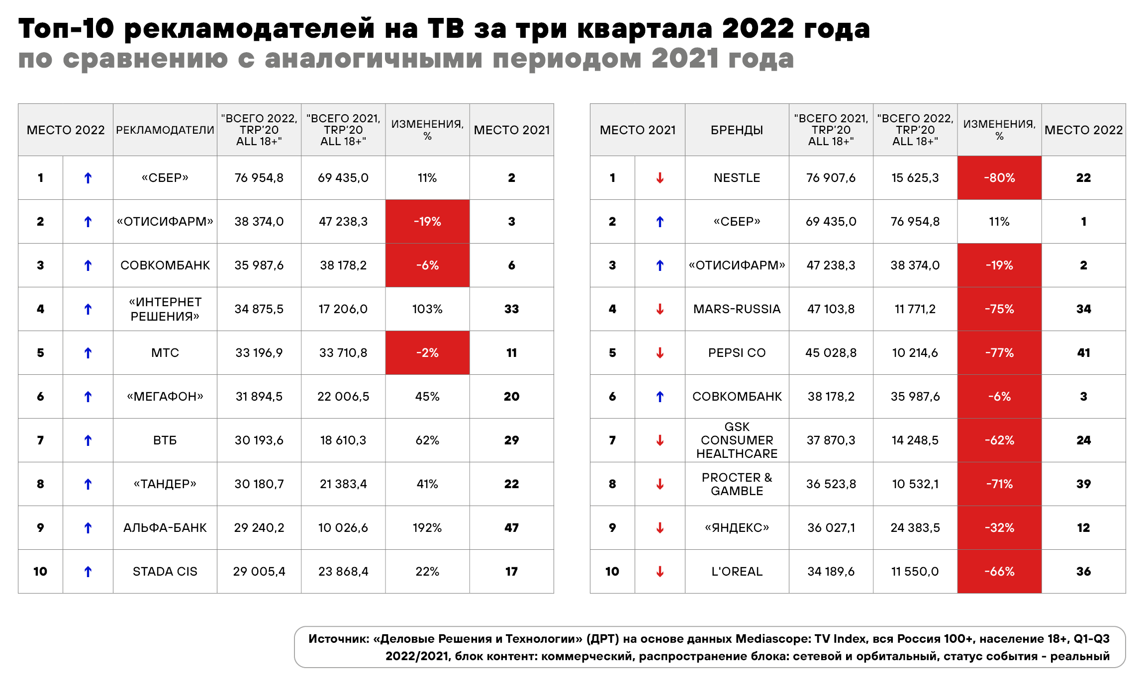 Транснациональные рекламодатели, в том или ином виде объявившие об уходе с российского рынка, покинули первую десятку, но сохранили позиции в топ-50 крупнейших на ТВ по итогам девяти месяцев: Nestle опустилась с первого на 22-е место, Mars-Russia — с четвертого на 34-е, PepsiCo — с пятого на 41-е, Procter& Gamble — с восьмого на 39-е, GSK — с седьмого на 24-е, L`Oreal — с десятого на 36-е.