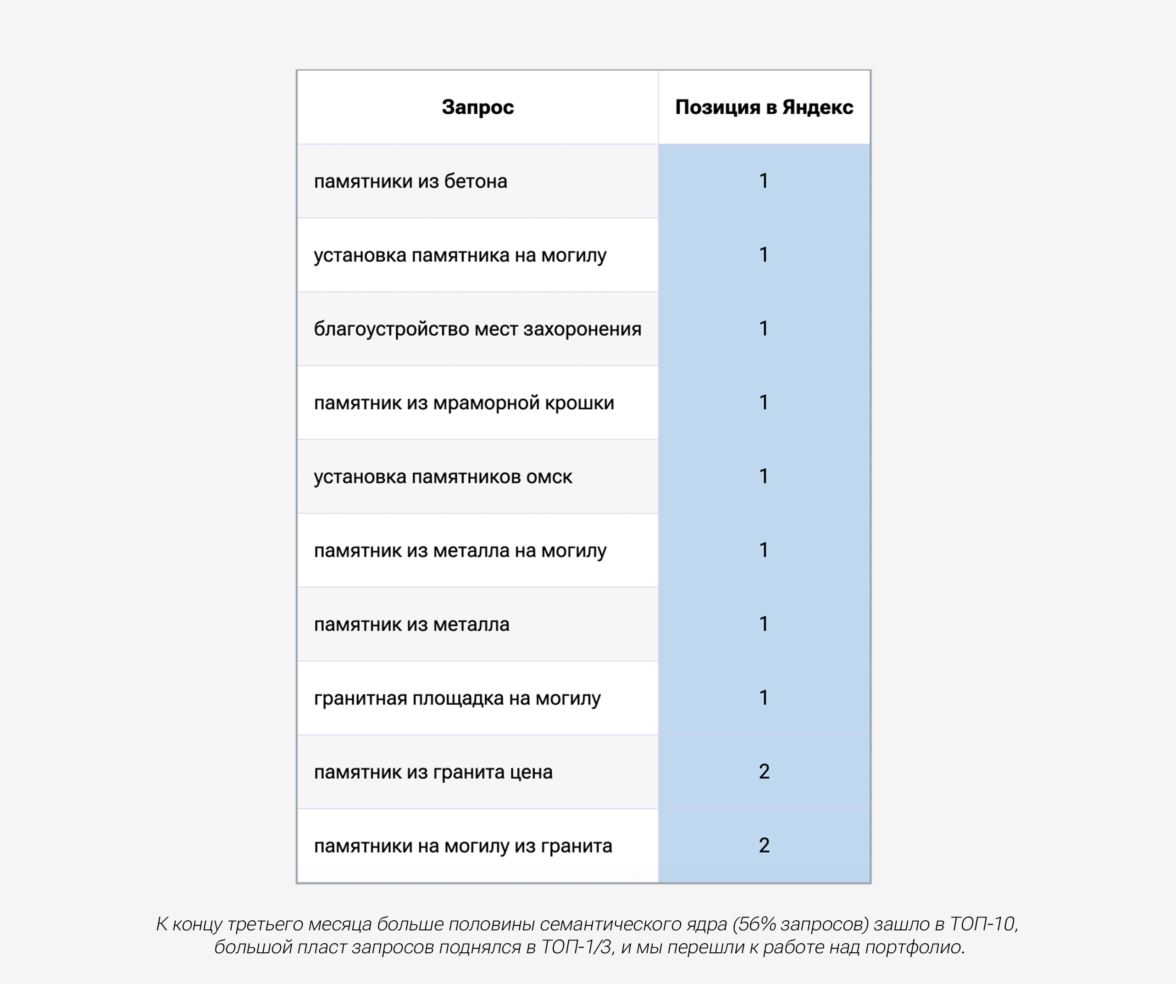 Несмотря на то, что в портфолио не планировалось посадочных страниц, хорошее наполнение положительно повлияло на общее качество сайта и поведение пользователей. Так что к середине 4 месяца (момент написания статьи) процент запросов в ТОП-10 увеличился, многие запросы закрепились в ТОП-1/3.