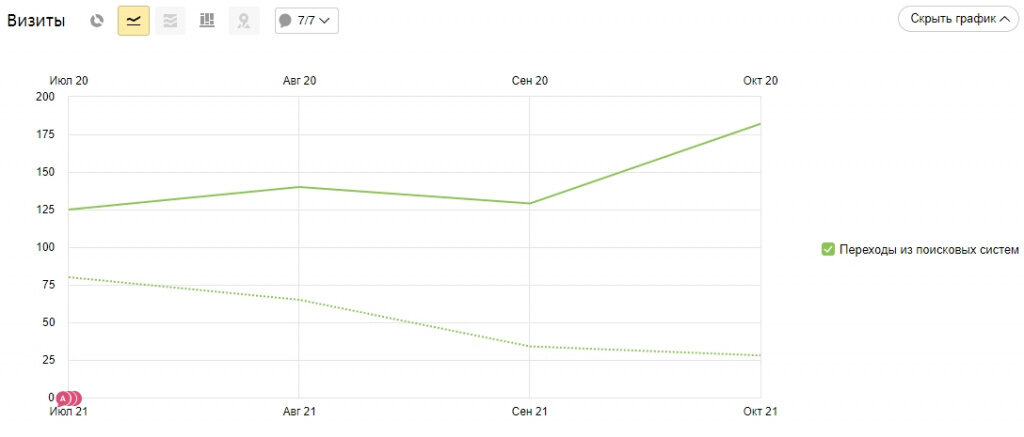 Количество переходов из поиска в октябре 2021 увеличилось в 6,5 раз относительно октября 2020. Снижение объема трафика в 2020 году связано с сезонностью бизнеса