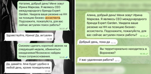 Те же принципы работают, когда вы сами оказываетесь в роли покупателя услуг. В поисках бизнес-ассистента я обратилась к двум кандидатам. Их резюме выглядели одинаково впечатляюще, но разница проявилась в первых же сообщениях. Одна девушка сразу предложила варианты времени для звонка, продемонстрировав уважение к моему графику. Вторая ответила односложно и без какой-либо инициативы. Собеседование закончилось, не успев начаться, потому что настоящий отбор происходит не в офисе за столом переговоров, а в мессенджере, в той самой первой фразе, которая говорит о стиле мышления больше, чем любая самопрезентация.