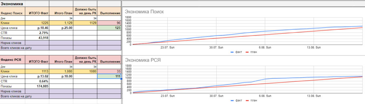 Ежедневный анализ нам помогала проводить автоматизация сбора данных с Яндекс метрики, Яндекс Директа и кабинета ВК. Все данные тянулись в Google-таблицы. На все важные параметры мы поставили фильтры, которые сигнализировали аналитику, что необходимо вносить корректировки в РК.