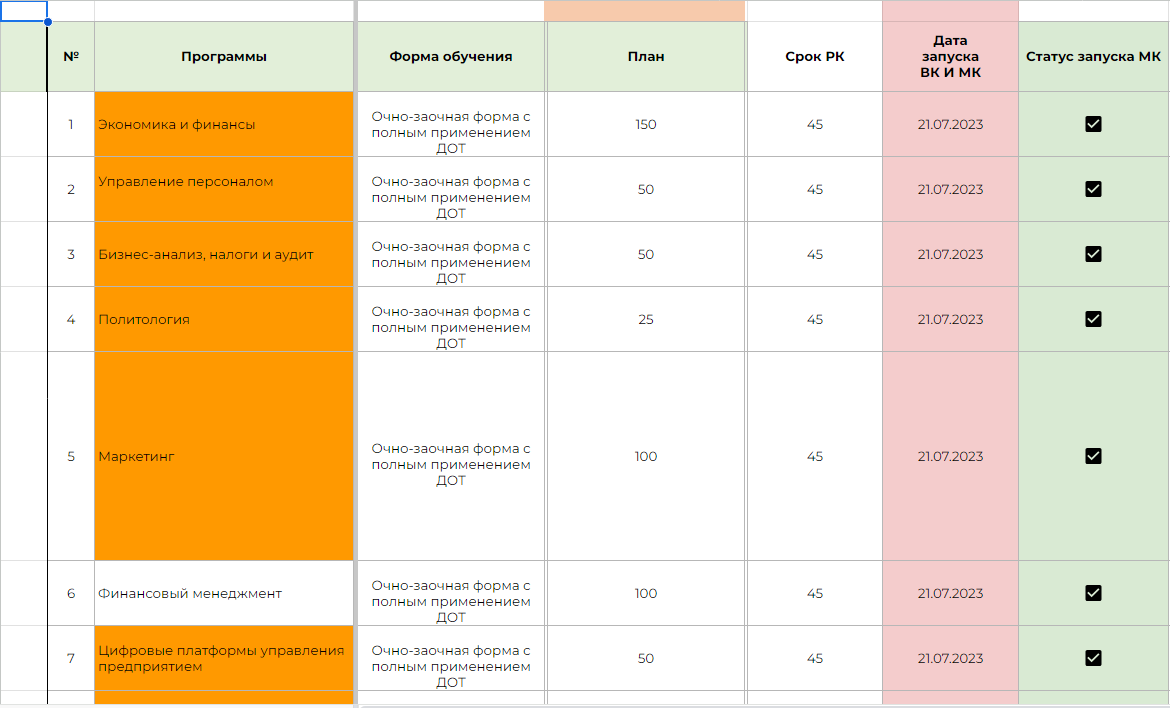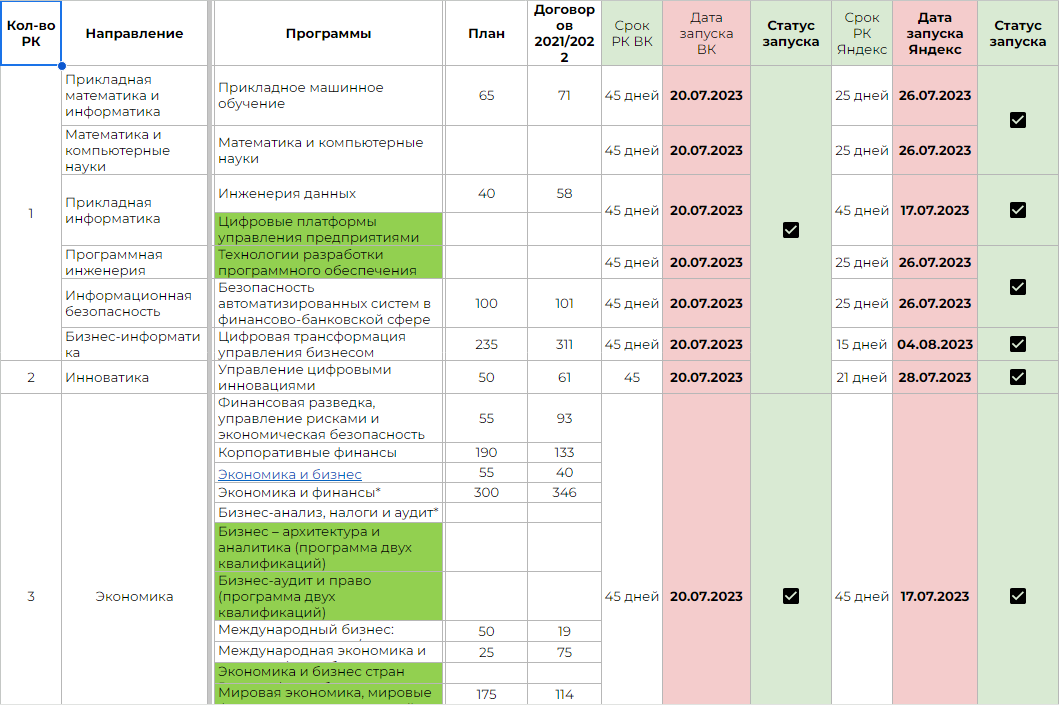 В первую очередь, мы отслеживали еженедельную сводку по набору на те или иные направления. На каждое направление мы рассчитывали конверсию сайта и определяли, какой объем трафика нам необходимо сгенерировать на каждое направление, чтобы выполнить план по набору.