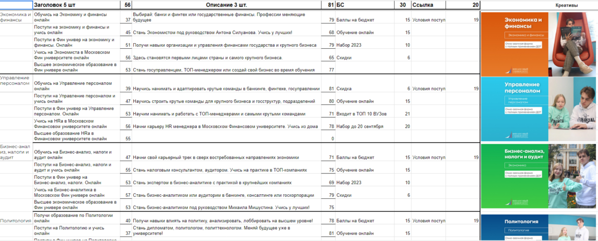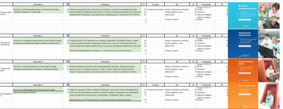 Для написания объявлений мы решили вынести призывы и факторы, влияющие на принятие решений из текстов, описывающих направления, которые были составлены профессиональными копирайтерами.