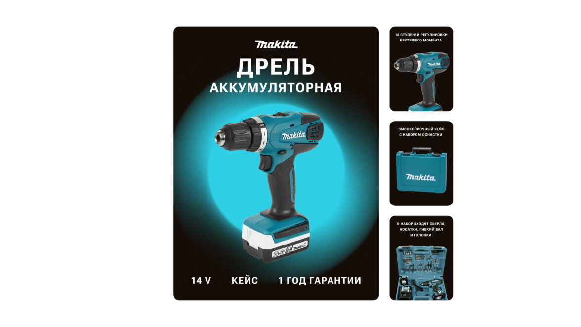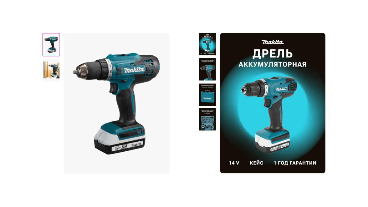 Со своей стороны мы решили раскрыть дрель на максимум. Добавили обложку с крупной фотографией, а также названием, назначением и инфографикой инструмента. В карточках рассказали о его дополнительных параметрах. На наш взгляд, для любителей посверлить — это набор насадок и состав кейса.