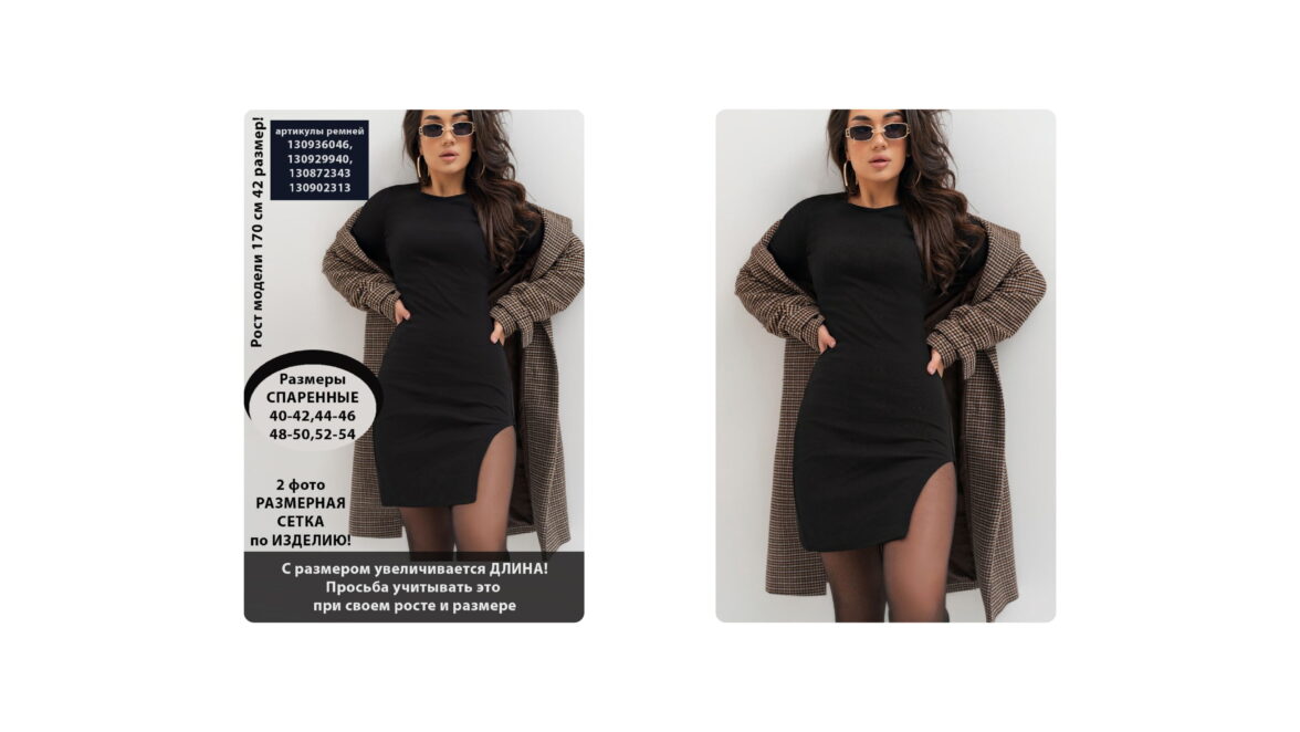 Главная задача дизайнера при работе с карточками одежды и аксессуаров — это качественная ретушь и цветокоррекция исходных фотографий. Поэтому мы вырезали с исходника все лишние блоки, перекрывающие обзор покупателям, и сместили центр композиции. Так внимание пользователей будет направлен на фасон и посадку одежды на модели.