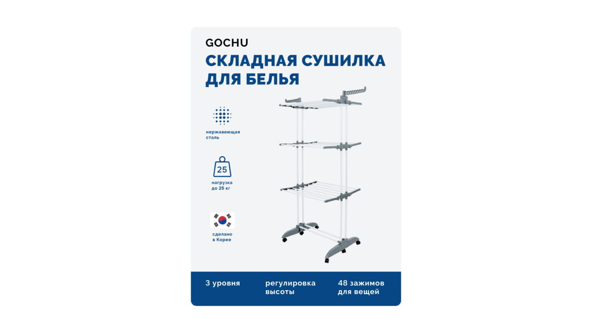 Мы решили избавиться от визуального шума на карточке и полностью изменить текущую иерархию элементов. В типографике сохранили два цвета — серый и синий. Унифицировали дизайн блоков, чтобы карточка выглядела цельно. И, конечно, выбрали фотографию сушилки без одежды, чтобы пользователи лучше рассмотрели товар.