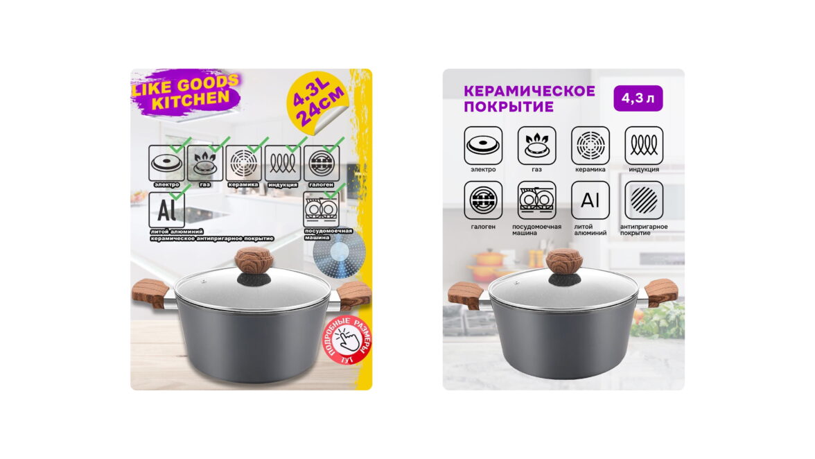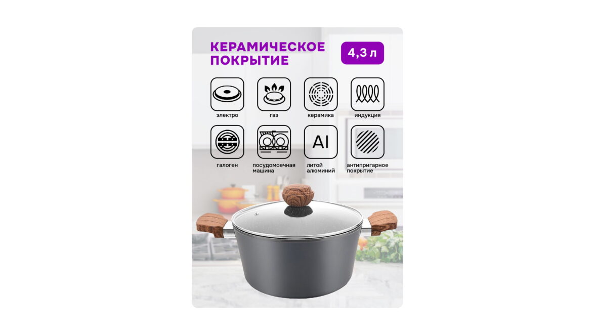 Яркие элементы с карточки решили полностью не убирать. Фиолетовым цветом выделили самые важные качества для кастрюли — материал покрытия и объём тары.
