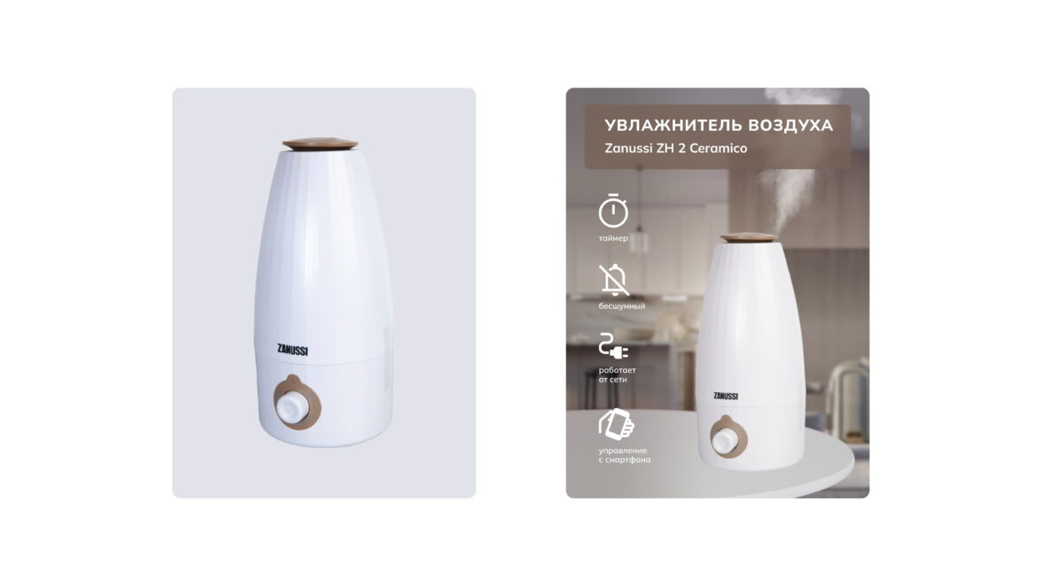 Новую карточку решили дополнить инфографикой. Указали основные параметры увлажнителя: часто они больше всего влияют на решение о покупке техники. Не забывайте показывать приборы в действии: мы сделали это с помощью облака пара. Так при скроллинге ленты WB покупатель без взгляда на текст понимает функциональное назначение устройства.