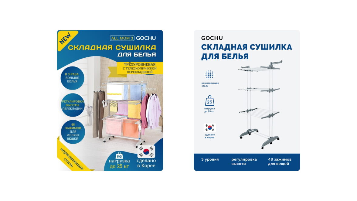 В дизайне нужно правильно расставлять акценты — разделять информацию на важное и второстепенное. На оригинальной карточке с сушилкой все элементы примерно одного размера и контрастности. Каждый перетягивает на себя внимание пользователя, в результате зрителю нужно лишний раз концентрироваться, чтобы разобраться в этой визуальной каше.